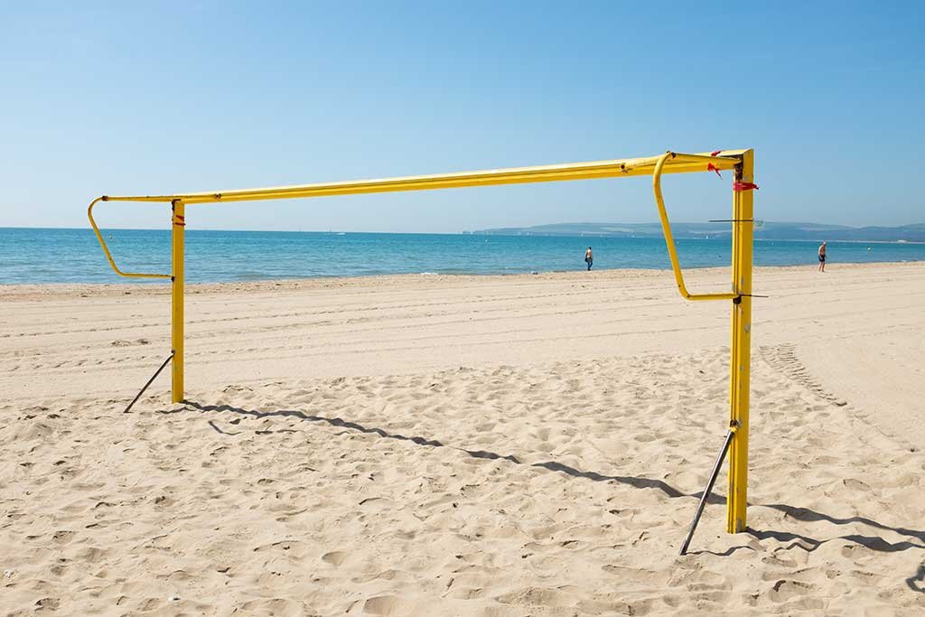 There are several volley ball nets and some football pitches located on the beach in the direction of Canford Cliffs (5 minute walk west heading towards Sandbanks). If no one is using them I think you can use them for free (not sure though) but if you want to guarantee availability you have to hire them in advance – best check at the beach office for correct information.