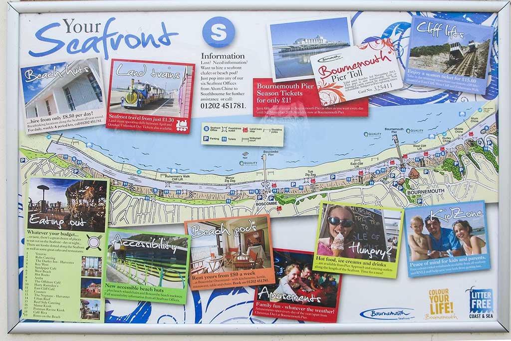 Seafront information. Fishermans Walk Beach is located to the left (east) of Boscombe Beach. It’s about a mile to Boscombe Beach when walking along the seafront promenade. It’s about 2.6 miles to Bournemouth Pier and should take about 50 minutes.