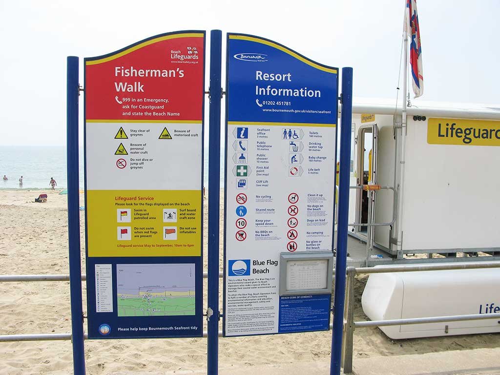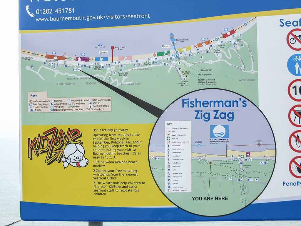 Access to the beach is by way of a long Zig-Zag path or by using the Fisherman’s Walk Cliff-Lift. The cliff-lift runs everyday between Easter and the end of October. (adult single £2.20, child under 16 £1.70, under 5s free, Family 2A+3C £7.20). Visit the web page www.bournemouth.co.uk for up to date information and ticket prices.