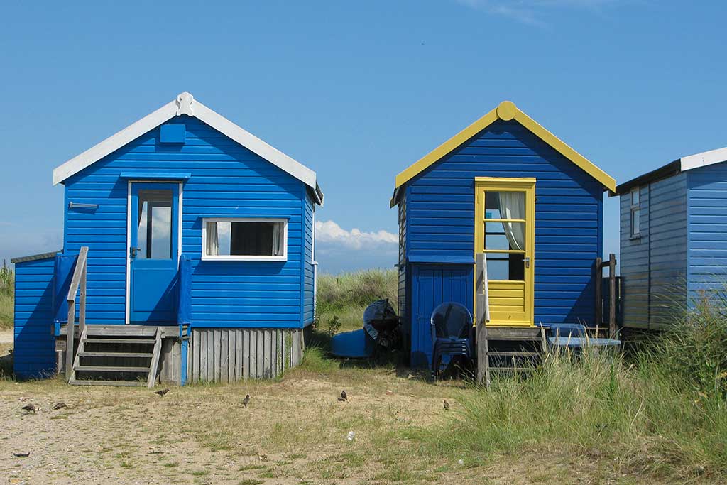 The beach is about 500m long and comprises golden sands backed with dunes and almost 300 colourful beach huts. Unlike other beach huts these ones are residential and can be stayed in overnight from April to October. Many of the huts are like tiny houses with kitchens and bedrooms upstairs. Some have recently been sold for more than £250,000 ! As well as the hefty purchase price owners have to pay annual rates of about £500 and a licence fee (ground rent) of about £2,500 a year.