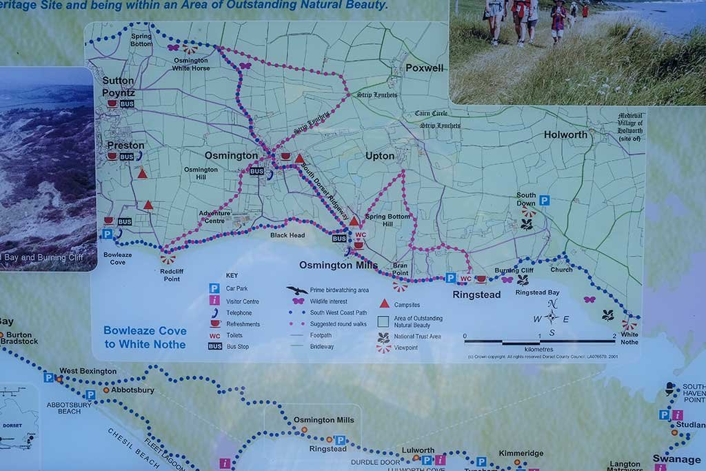At the eastern end of the Ringstead Bay is White Nothe headland. It takes about 40 minutes to walk there and you’ll be rewarded with great sea views and in summer you’ll see loads of wild flowers and butterflies. If you continue along the coast path for another hour you’ll eventually arrive at Durdle Door. In my opinion White Nothe to Durdle Door section is best done by starting at Durdle Door. There’s easy parking at Durdle Door and White Nothe can be included as part of a circular walk. You can then come to Ringstead and walk out to White Nothe picking up from where you left off, completing the Dorset section of the South West Coast Path bit by bit. There is a map showing the various walks in the car park near the cafe. The walk west from the car park towards Osmingston Mills is also a pleasant stretch of the coastline.
