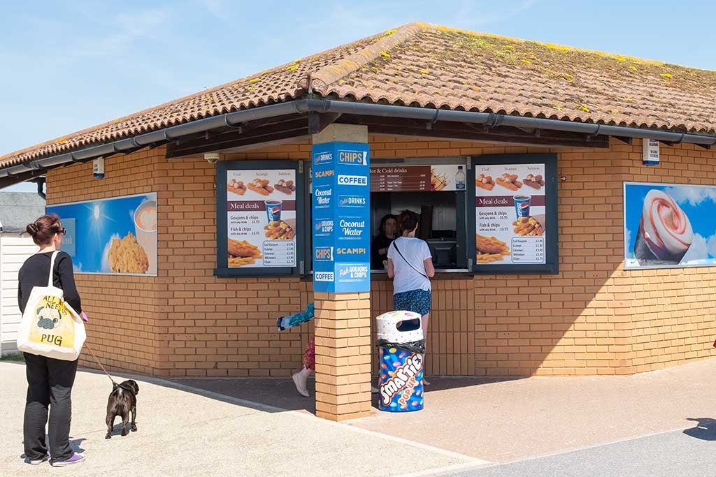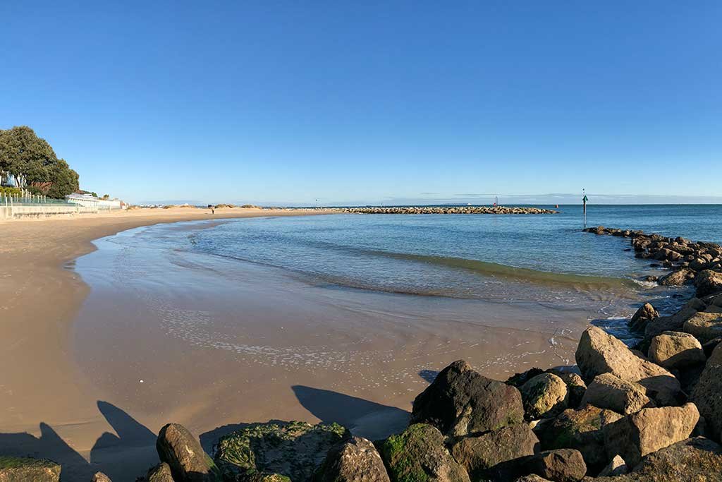 Facilities include public toilets, drinking water, restaurant/cafe, ice-cream/cafe kiosk, beach shop, beach office with first-aid and a designated barbecue zone toward the western end of the beach.
